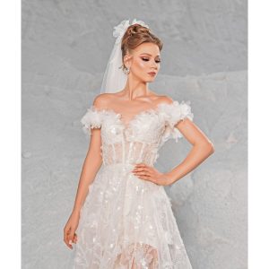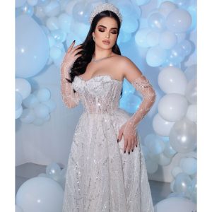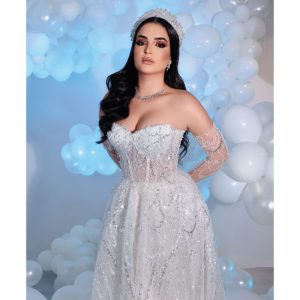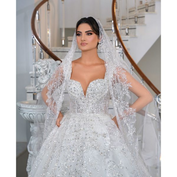 Robe de mariage princesse, ornée de cristaux scintillants sur toute la surface et confectionnée à partir d’un tissu luxueux haut de gamme.