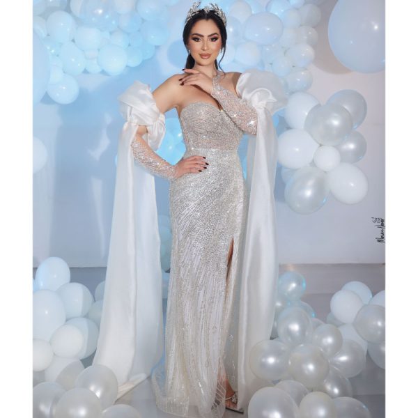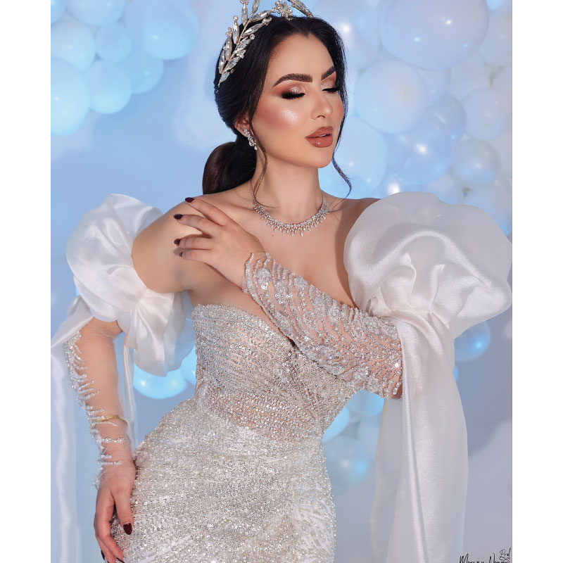 Robe de mariage sans bretelles, dotée de manches amovibles longues en satin et de somptueuses broderies argentées sur un tissu de luxe