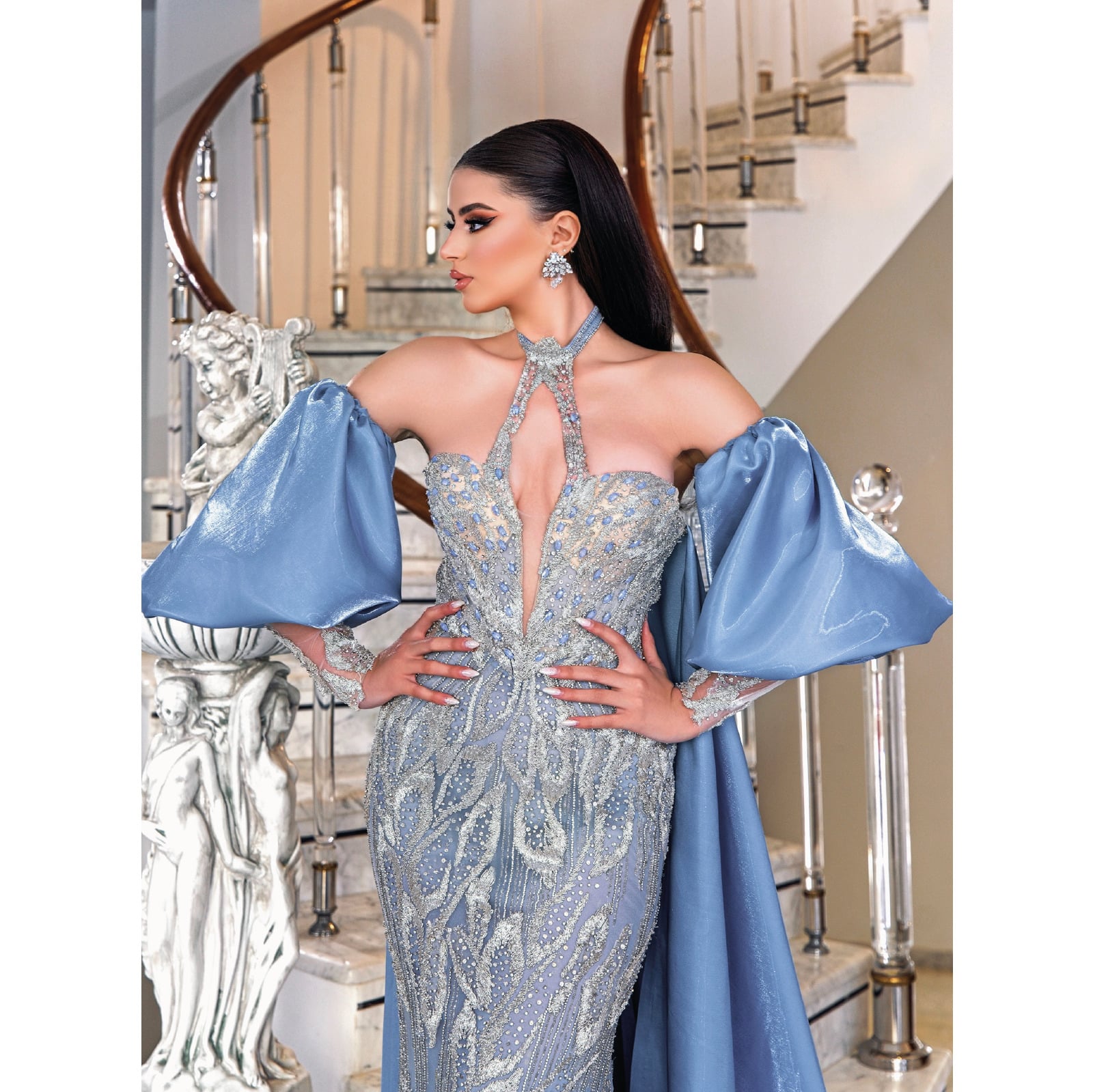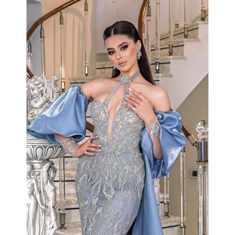 robe fashion, dotée de manches amovibles longues et d’une traîne majestueuse. Confectionnée dans un somptueux mélange de satin et de tissu brodé aux motifs argentés
