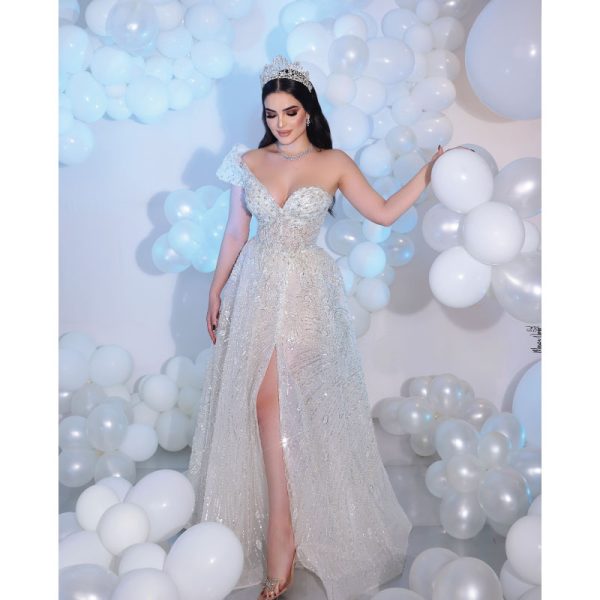 Robe de mariage, arborant une seule manche tombante ornée de motifs et de cristaux argentés pour une touche de sophistication ultime.