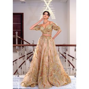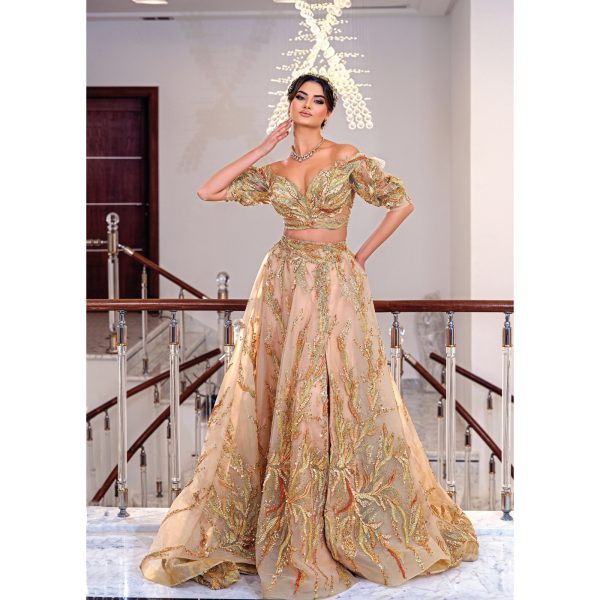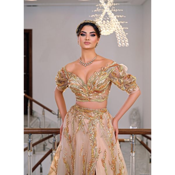 robe orientale, composée d’une jupe et d’un corsage ornés de motifs orange et dorés. Cette tenue raffinée et éclatante combine tradition et modernité