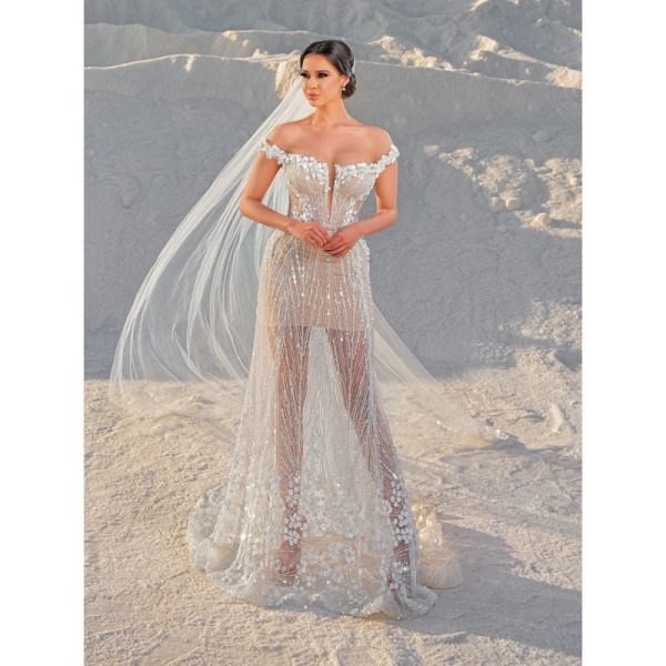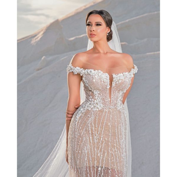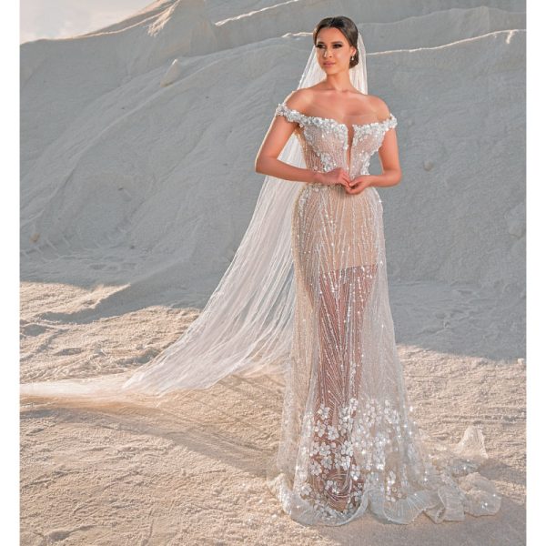 Robe couleur tendre, agrémentée de délicates fleurs blanches. Une fusion parfaite entre élégance et modernité .