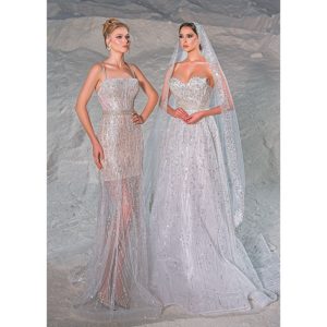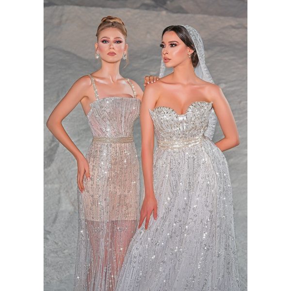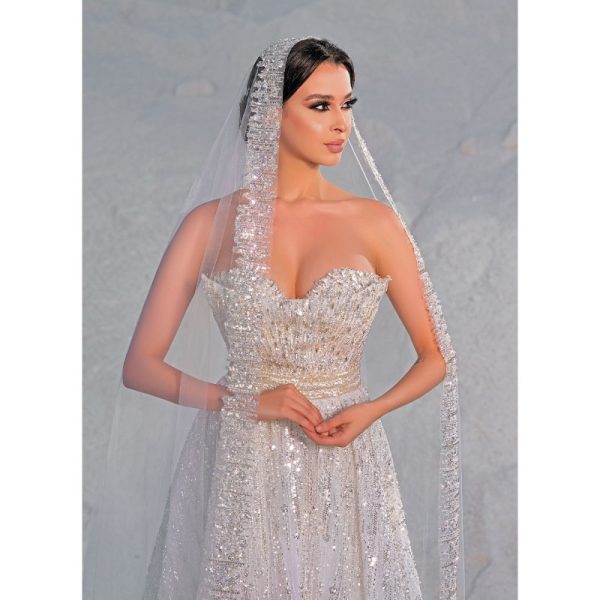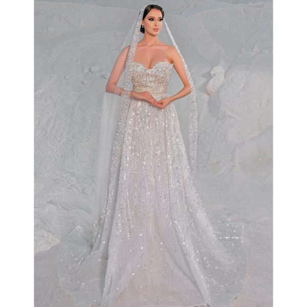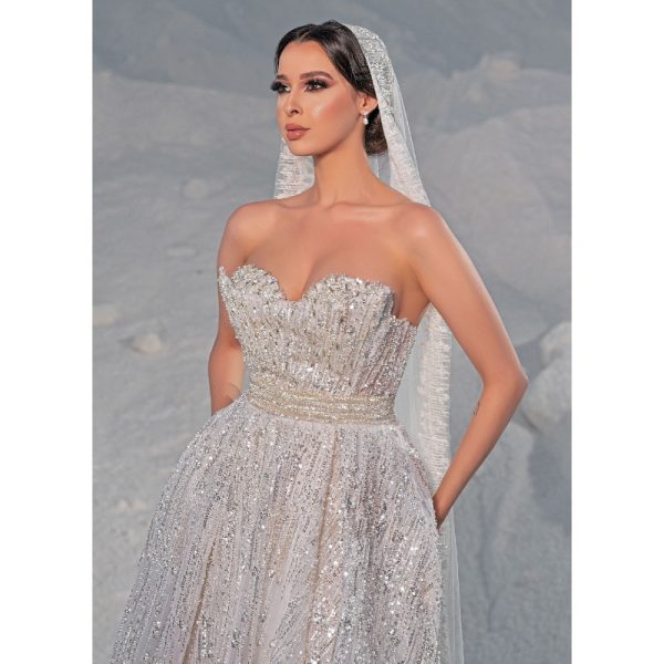 robe de mariage sans bretelles, confectionnée dans un luxueux tissu argenté et ornée d’une ceinture subtilement collée à la taille